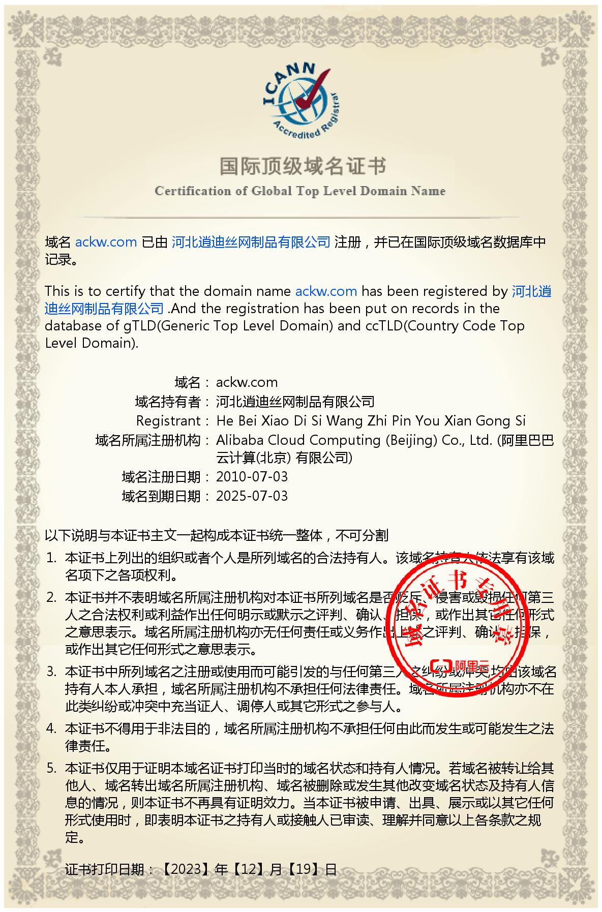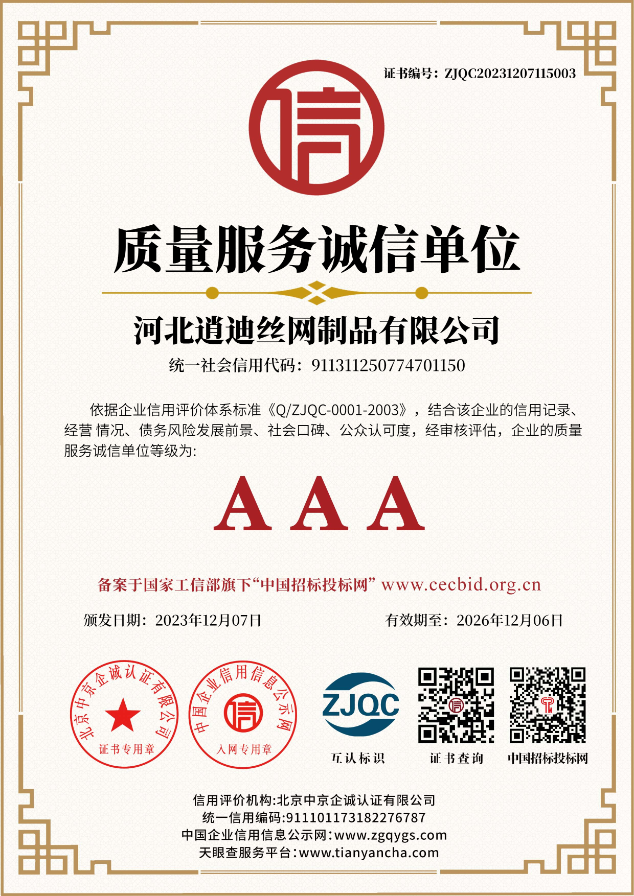 注意:AAA企業資信等級證書-獲取時間為:2023年12月07日 到期時間為2026年12月06日到期后無效